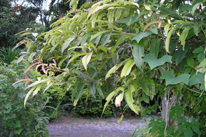 รูปลักษณะเป็นไม้ต้นผลัดใบ สูง 5-15 เมตร ลำต้นเป็นปุ่มปม ปลายกิ่งลู่ลง ใบอ่อนสีน้ำตาลแดง ใบเดี่ยว ออกเวียนสลับถี่ตอนปลายกิ่ง รูปใบหอกหรือรูปไข่กลับ กว้าง 10-13 ซม. ยาว 20-30 ซม. ปลายจะผายกว้างแล้วแหลม โคนแหลมขอบจักถี่ ดอก ออกเป็นช่อยาวที่ปลายกิ่งสีแดง ห้อยลง ยาว 30-40 ซม. กลีบเลี้ยง 4 กลีบ หลุดร่วงง่าย เมื่อบานเส้นผ่าศูนย์กลางประมาณ 2 ซม. เกสรตัวผู้สีแดงจำนวนมาก ผลกลมยาว เส้นผ่าศูนย์กลางประมาณ 2.5 ซม. ยาว 3-4 ซม. มีสันตามยาว 4 สัน <br>