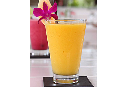 2. นำเนื้อมะม่วงสุกปั่นให้เข้ากันกับน้ำเสาวรส เนสทีชามะนาว น้ำแข็ง และน้ำเปล่า ปั่นให้เข้ากัน
