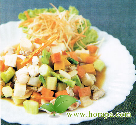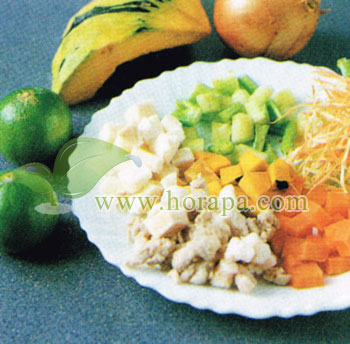 ยอดคะน้า ยอดมะพร้าว หมูติดมัน ฟักทอง แครอต กุ้งสด