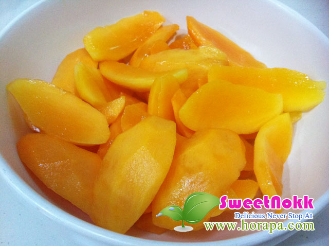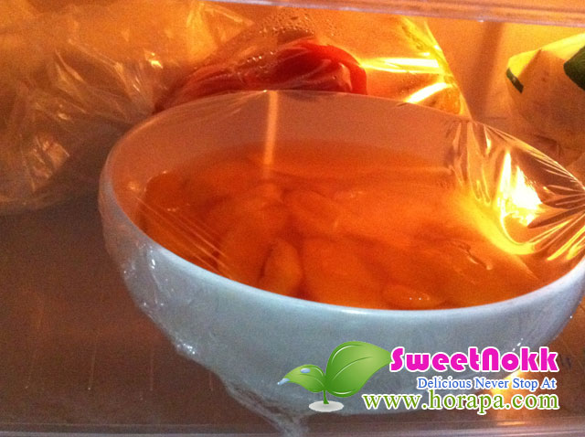 เมื่อน้ำเชื่อมเย็นให้นำมาราดบนมะยงชิดให้ท่วม หรือราดทั้งหมดก็ได้ จากนั้นห่อพลาสติกและนำเข้าตู้เย็น แช่ค้างคืนหรืออย่างน้อย 2 ชั่วโมง