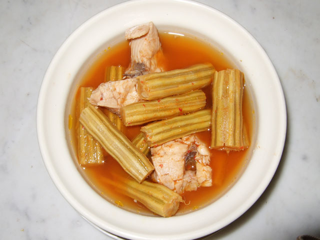 7. ใส่มะรุมที่ตัดเป็นท่อน เคี่ยวในน้ำแกง หม้อนี้เอาใจทั้งท่านที่มีอารมณ์สุนทรีย์ อยากจะครูดเนื้อมะรุมด้วยฟันของตัวเอง แล้วก็เอาใจท่านที่ไม่อยากมือเลอะด้วย