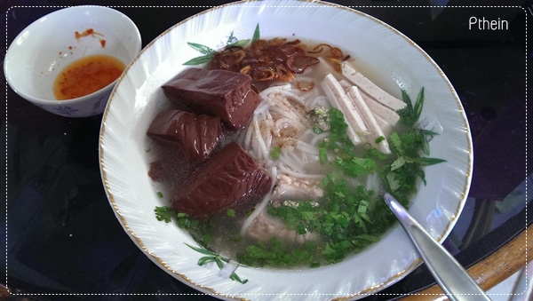 เมื่อจะเสิร์ฟตักเลือดและโรยหอมเจียว โรยผัก และหมูยอหั่นชิ้นลงไปเป็นอันเสร็จ