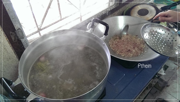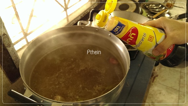 ต้มน้ำซุปโดยใส่กระดูกหมู หอมแดง และรากผักชีลงไป
