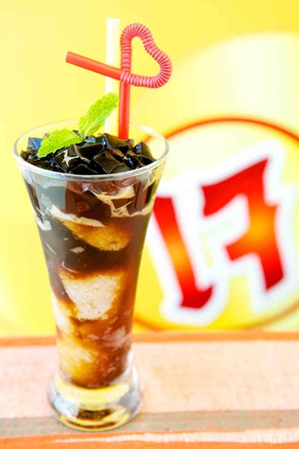 ขั้นตอนการทำ: เทน้ำเปล่าใส่แก้วชง 30 มิลลิลิตร ตามด้วย เนสกาแฟเรดคัพ คนให้เข้ากัน แล้วใส่น้ำเปล่าที่เหลือ ตามด้วย น้ำตาลทรายแดง น้ำแข็ง ปั่นพอเป็นเกล็ดละเอียด เทลงในแก้ว ตามด้วยเฉาก๊วยและค่อยๆ รินกาแฟในข้อที่ 1 ลง พร้อมดื่มทันทีขณะเย็น