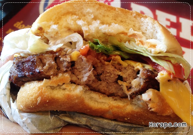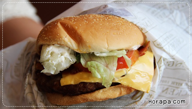 เบอร์เกอร์ก็จะห่อมาในกระดาษแบบนี้เลยค่ะ ชิ้นใหญ่หนามากๆ ตอนที่ยังไม่ได้แกะห่อยังไม่ได้รู้สึกอลังการอะไรมาก รู้แค่ว่าใหญ่ค่ะ