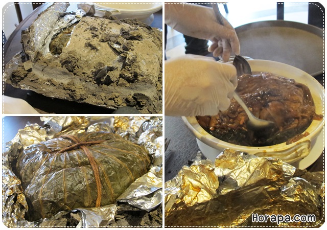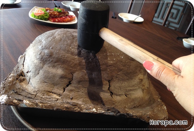 เชฟบอกเราว่า จริงๆแล้ว เค้าไม่ได้เสิร์ฟมาทั้งดินเหนียวอย่างนี้หรอกนะคะ แต่ใครเป็นเจ้ามือจะได้รับค้อนเพื่อมาทุบเหมือนกับว่าเราจะเริ่มทานกันแล้ว เจ้ามือก็จะใช้ค้อนทุบดินเหนียวที่ห่อหุ้มไก่เอาไว้ จากนั้น ก็จะไปแกะไก่ใส่จานในห้องครัวค่ะ ซึ่งไก่ขอทานเค้ามีประวัตินะคะ ทำให้หลายๆคนอยากจะลิ้มลองเนื้อไก่ที่ซุกอยุ่ในก้อนดินเหนียว