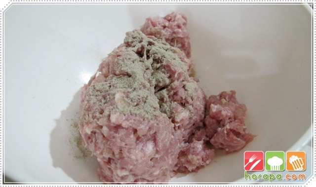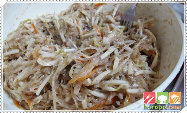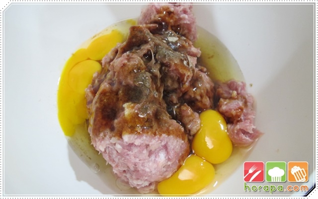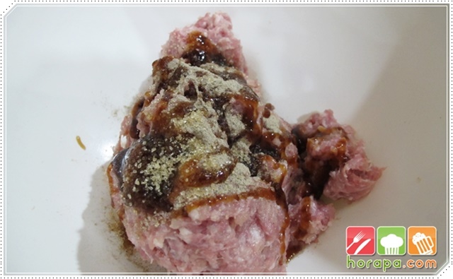เติมซอสหอยนางรม น้ำปลาและน้ำตาลทราย เราจะไม่ใช้เกลือในการปรุงเพราะจะทำให้ไส้แห้งเกินไปค่ะ