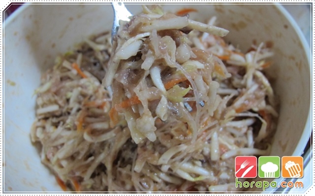 เติมเห็ดหูหนู แครอทและหอมหัวใหญ่ แล้วคลุกให้เข้ากัน ใส่ถุงมือพลาสติกจะได้สะดวกค่ะ