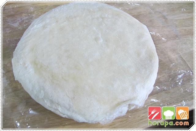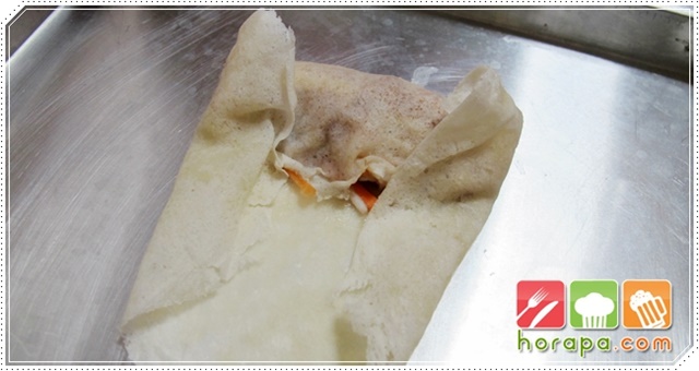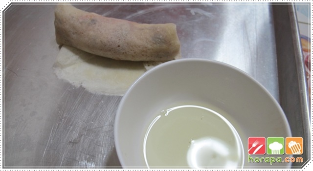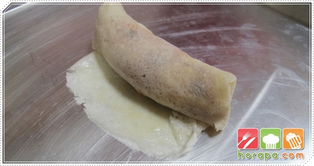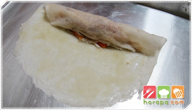 เอาแป้งปอเปี๊ยะออกมากาง 1 แผ่น แล้วใส่ไส้ไว้ด้านหนึ่งให้ได้ปริมาณที่พอดี