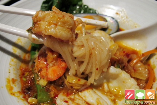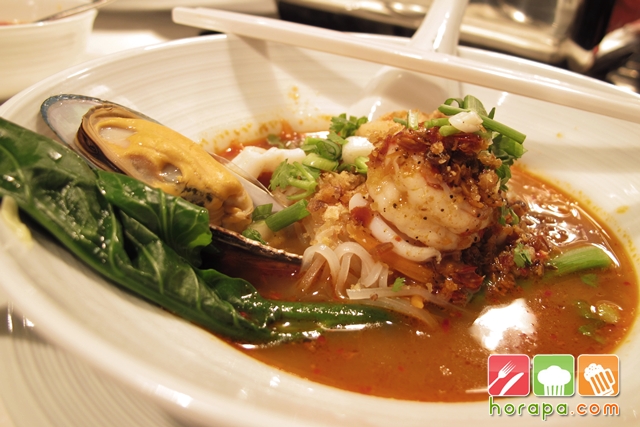 มี กุ้ง หมึก รสจะไม่เผ็ดมากค่ะ ทานกำลังดี แต่มีเครื่องปรุงให้เราปรุงเพิ่มนะคะ