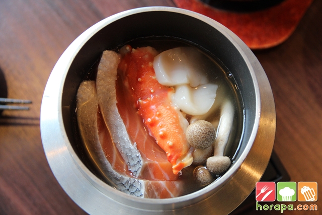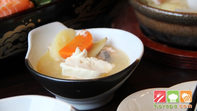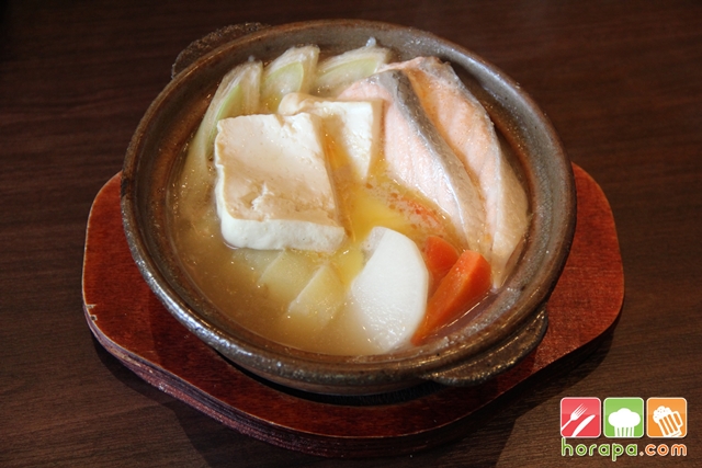 ปลาแซลมอนชิ้นโตในหม้อดินเสิร์ฟร้อน เต็มอิ่มน้ำซุปจากปลา รสหวานกลมกล่อมผสมผสานมิรินและปลาแห้งญี่ปุ่น กลมกล่อมหอมหวานด้วยหัวไชเท้า แครอท กะหล่ำปลี เต้าหู้ถั่วเหลืองและใส่เนยเพิ่มความหอม เหมาะสำหรับคนรักในสุขภาพ ซดคล่องคอ