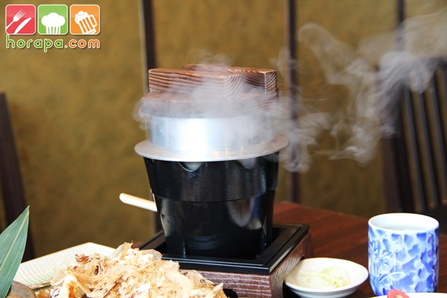 สำหรับข้าวอบฮอกไกโด จะมีอยู่ 2 แบบค่ะ แบบแรกคือทางร้านหุงข้าวให้สุกพร้อมเสิร์ฟ ซึ่งเราจะต้องโทรสั่งล่วงหน้า 1 วัน อาจจะจองเวลาเอาไว้ด้วยค่ะ เพื่อจะได้ทานร้อนๆ แบบที่สอง คือมาแบบภาพด้านบน ข้าวจะดิบ อาหารจะยังไม่สุก มาพร้อมน้ำซุปในหม้อ และจะจุดไฟเอาไว้ใต้หม้อ (หม้อก็เหมือนที่ญี่ปุ่นเลยค่ะ) จากนั้นก็รอเวลา 20 นาทีให้อาหารในหม้อสุก