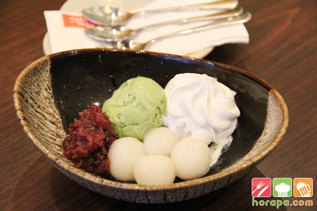 เสิร์ฟแบบจัดเต็มด้วยไอศครีมชาเขียวมัทฉะเข้มข้นเสิร์ฟพร้อมซอฟท์ครีมเข้มข้น ทางร้านตีขึ้นเองและโมจิเหนียวนุ่มและถั่งแดงเย็น หวานเย็นลงตัว