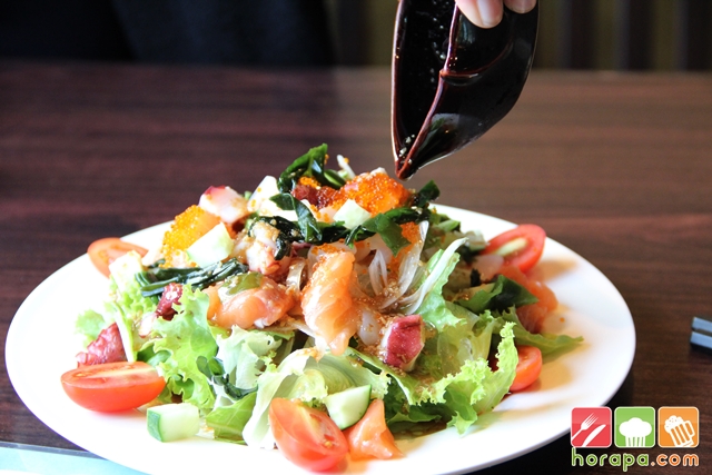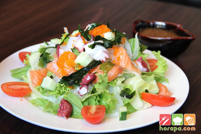 สลัดทะเลรวมของดี อาทิ กุ้งหวานอามะเอบิ หนวดปลาหมึก ไข่กุ้ง เนื้อปลาแซลมอน ผักสลัด ผักคอซ แตงกวา มะเขือเทศ พร้อมน้ำสลัดงาสไตล์ญี่ปุ่น