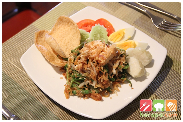 จานนี้เป็นอาหารอินโดนีเซีย จะมีรสชาติหวานคล้ายๆยำถั่วพลูค่ะ ถั่วฝักยาวกรุบกรอบ เต้าหู้ทอด ไข่ต้ม โรยด้วยกระเทียมและหอมเจียว อร่อย ทานเพลินมาก