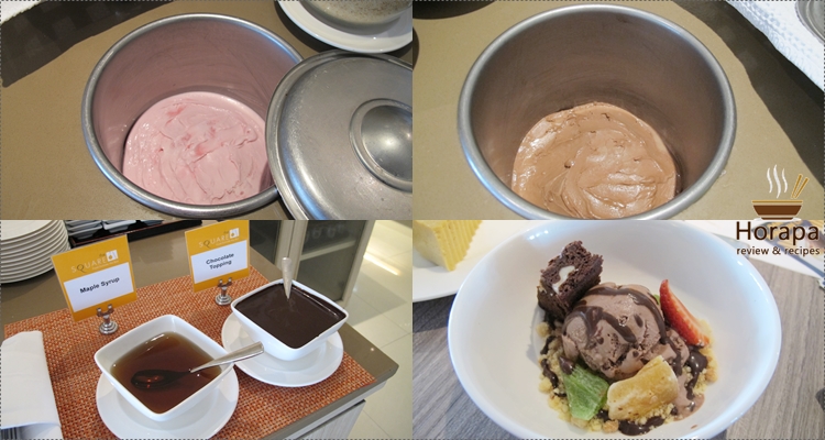 ไอศกรีมจะมีสองรส นกไปเอาบราวนี่มาใส่ตกแต่งถ้วยค่ะ ผลไม้อบแห้งก็จากจานบราวนี่ค่ะ