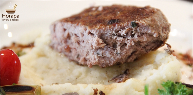 จริงๆแล้วนกชอบกินเนื้อมากนะคะ แต่จานนี้เนื้อมาแบบแน่นมากค่ะ ชิ้นใหญ่มากนะคะ วางอยู่บนมันบดค่ะ