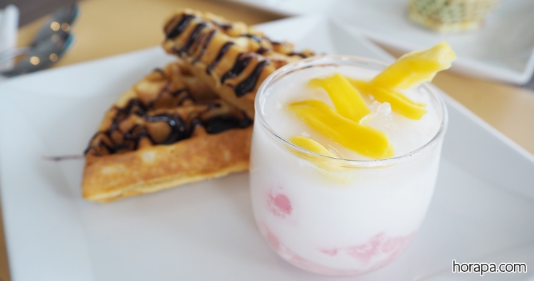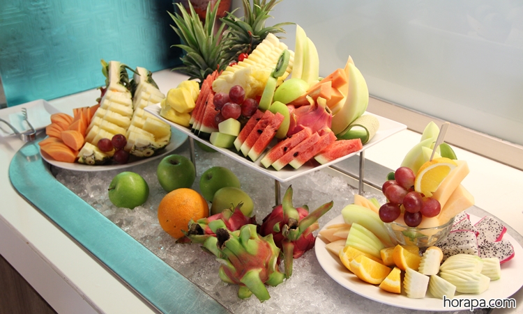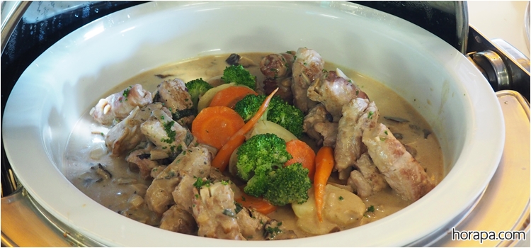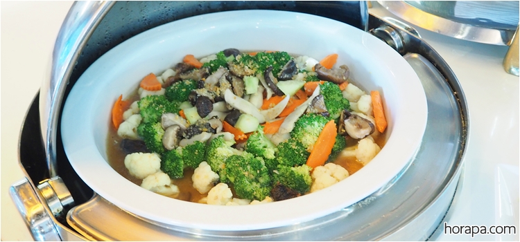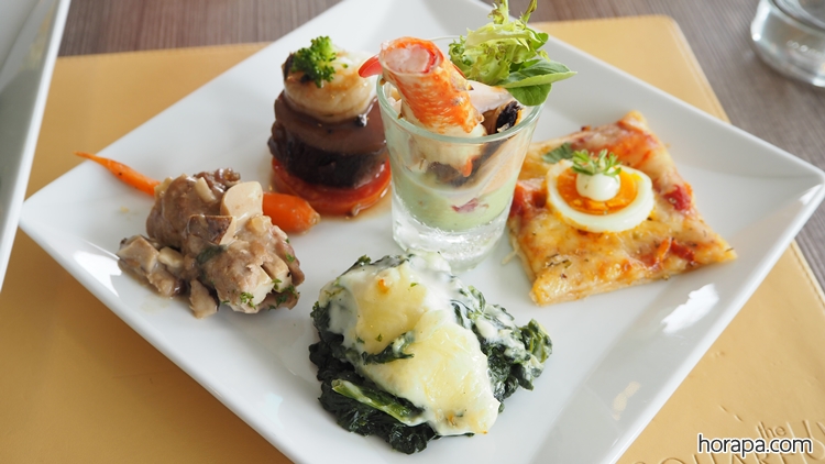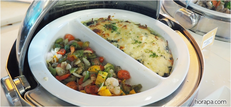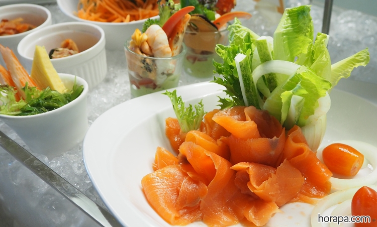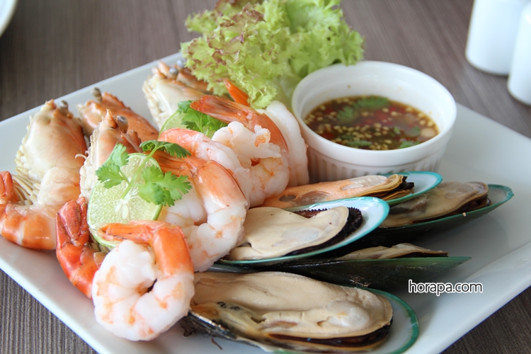 สำหรับมื้อเย็นที่นี่จะมีซีฟู้ด : กุ้งแม่น้ำ, กุ้งขาว, หมึก, หอยแมลงภู่นิวซีแลนด์ ส่วน Brunch เสาร์-อาทิตย์ จะมีซีฟู้ดเพิ่มเติมคือ หอยนางรมและปูอลาสก้าด้วยค่ะ