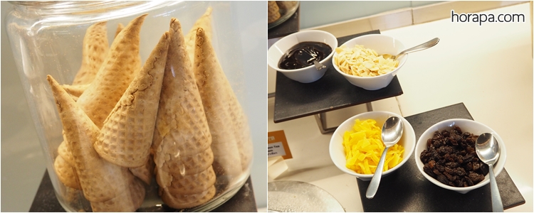 มีโคนให้ด้วยหรือตักใส่ถ้วยแล้วเติมท๊อปปิ้งก็ได้