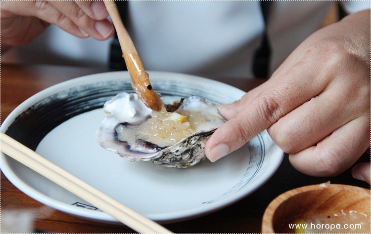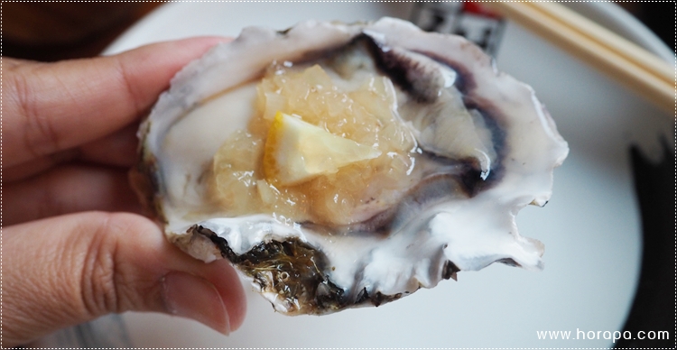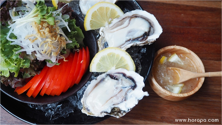 อิโรฮะสลัด พร้อมกับหอยนางรมตัวโต เสิร์ฟคู่กับน้ำซอสรสเด็ดที่ทางร้านบอกว่าคิดขึ้นมาเพื่อที่ลูกค้าจะได้ม่ต้องบีบเลมอน