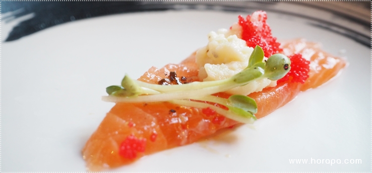 อย่างที่เห็นในจานจะมีแซลมอนสองส่วน ส่วนที่เป็นกุหลาบจะมีมันฝรั่งบดด้านในและโรยด้วยไข่กุ้งค่ะ