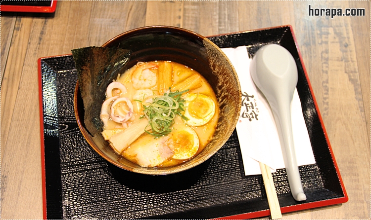 ราเมนแบบไทย * เข้มข้นรสชาติจัดจ้านแบบไทย ที่รวมเครื่องทะเล อัดแน่นเต็มชาม ทั้งปลาหมึก ปูอัด กุ้ง หมูชาชู ต้นหอมและไข่ต้ม