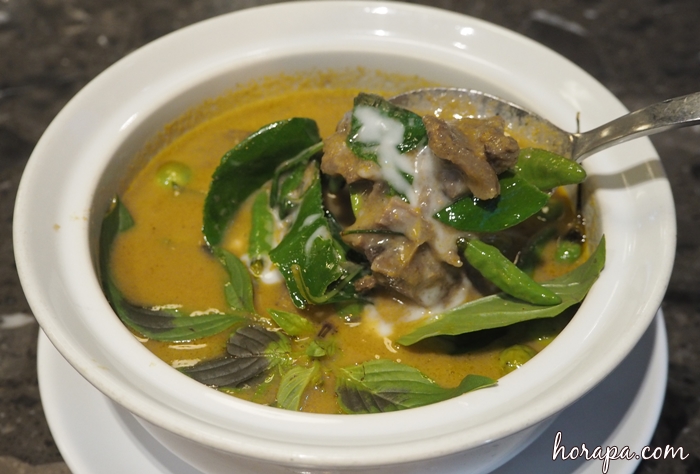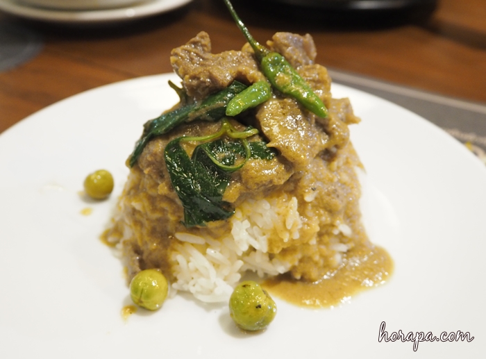 เมื่อเราลองชิมแล้ว รู้เลยว่าต้องกินกับข้าวสวยร้อนๆๆๆๆ เราเลยสั่งข้าวมา 1 จาน พร้อมจัดแจงราดแกงพริกขี้หนูเนื้อน่อง ผลปรากฎว่าอร่อยมากขึ้น ความเข้มข้นที่เมื่อรับประทานกับข้าวสวยทำให้ได้รสชาติกลมกล่อมที่พอดี ไม่เค็ม จะออกรสปะแล่มๆเท่านั้น ส่วนความหวานไม่มีค่ะ เพราะไม่ใช่แกงเขียวหวานนะคะ เราจะได้รสขมนิดๆ แต่ไม่แน่ใจว่าจากสมุนไพรใดค่ะ แต่ความขมกลับทำให้อาหารอร่อยขึ้นมาก ไม่เลียน ที่สำคัญเนื้อน่องนุ่มและเคี้ยวง่ายมาก ความหอมของเนื้อทำให้เราชื่นชอบเมนูนี้เลยค่ะ