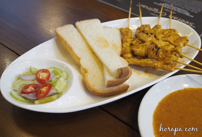 หมูสะเต๊ะ เสิร์ฟคู่ขนมปัง น้ำจิ้มและอาจาด