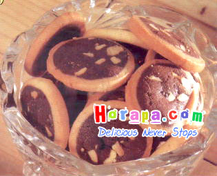 3.  นำส่วนผสมที่ได้มาปั้นเป็นแท่ง เส้นผ่าศูนย์กลางประมาณ 1 นิ้ว วางบนแผ่นแป้งที่เป็นสีขาว (แบ่งแป้งออกมาส่วนหนึ่งโดยไม่ต้องใส่ผงโกโก้และถั่วลิสง นำมาคลึงเป็นแผ่นหนาประมาณ 1/2 ซม.) ม้วนให้กลมนำเข้าตู้เย็นจนกระทั่งอยู่ตัว