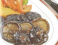 1. เลือกเห็ดหอมดอกใหญ่ แช่น้ำค้างคืนไว้ให้นุ่ม เอาเห็ดหอมบีบน้ำให้หมาด ใส่กระชอนพักไว้