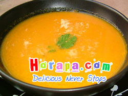 นำแครอทไปปั่นจนละเอียด เทกลับใส่หม้อ ปรุงรสด้วยเกลือและพริกไทย รอให้เดือด แล้วใส่นม ต้มต่อไปอีกสักครู่ยกลงพักให้เย็น ก่อนรับประทานกับน้ำส้มคั้น ตกแต่งด้วยเนื้อและเปลือกส้ม พาร์สลีย์ ให้สวยงาม