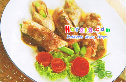 4. นำน้ำมันใส่กระทะพอร้อน ใส่กระเทียมผัดให้หอม ใส่น้ำมันหอย ซีอิ๋วขาว น้ำตาลทราย พริกไทย ซอสปรุงรส ชิมรส เมื่อรสดีแล้วตัดราดบนปลาที่ม้วนแล้วให้สวยงาม
