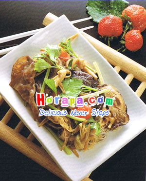 3. ใส่น้ำมันในกระทะ ตั้งไฟให้ร้อน ใส่เห็ดหอมลงผัด ใส่ซีอิ๊วขาว น้ำตาลทราย ผัดสักครู่ให้เห็ดหอมนุ่ม และเครื่องซึมเข้าเนื้อเห็ด