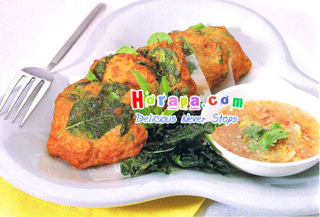 2. ตั้งกระทะใส่น้ำมันพอร้อน นำทอดมันลงทอดเป็นชิ้นๆจนสุกเหลือง รับประทานคู่กับน้ำจิ้ม