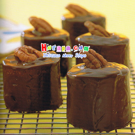 5. ราดหน้าด้วยช็อคโกแลตกานาสจนทั่ว พักไว้จนแข็งตัว ตกแต่งด้วยพีแคนนัท