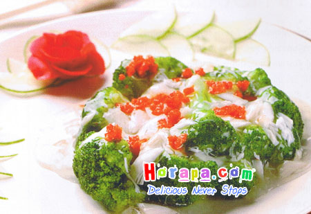 3. ราดน้ำซุปลงบนผักบรอกโคลีที่ลวกแล้ว โรยหน้าด้วยมันปู พร้อมเสิร์ฟ
