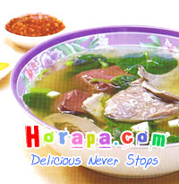 7. เวลาจะทาน เตรียมชามใส่ตำลึงตามชอบ ใส่เลือดหมู หมูลวก เครื่องในลวก ตักน้ำซุปพร้อมหมูสับที่เดือดจัดใส่ลงในชาม โรยหน้าด้วยขึ้นฉ่ายหั่นฝอยและพริกไทยป่น เสิร์ฟพร้อมเครื่องปรุง และข้าวสวยร้อนๆ