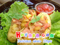 3. ปรุงรสด้วย ซีอิ้วขาว น้ำตาลทราย พริกไทย ผัดจนเครื่องปรุงสุกได้ที่ แล้วยกขึ้นใส่ชามพักไว้ จากนั้นให้นำไปใส่ในมันฝรั่งที่เตรียมไว้ให้เต็ม และนำเนยมาทาบนผิวมันฝรั่งจนทั่ว จัดวางในภาชนะสำหรับเข้าเตาอบ ใช้ไฟกลาง เมื่อครบ 10 - 15 นาที ก็ยกออกจากเตา  ยกเสิร์ฟร้อนๆ รับประทานได้ทันทีค่ะ
