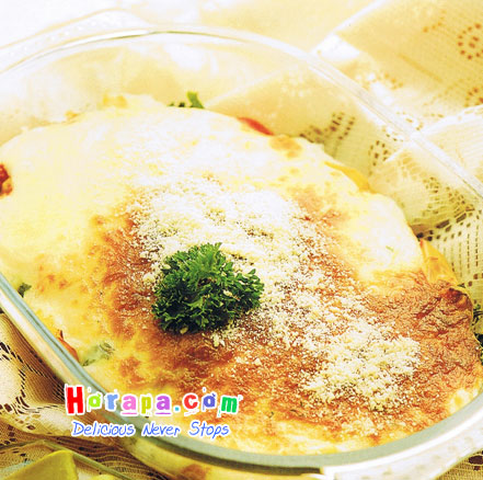 6. นำเข้าเตาอบไฟ 190 องศาเซลเซียส ประมาณ 35 นาที จัดเสิร์ฟขณะร้อนจัด