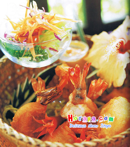 5. เสิร์ฟด้วยการเรียงไว้ในตะกร้าหมดทุกอย่างทั้งผักสด กุ้งและครีมชีส