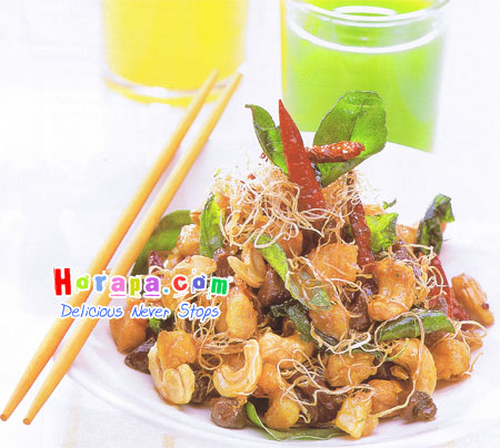 5. นำส่วนผสมข้อ 1 และ 2 ที่เตรียมไว้ลงผัด ใส่เมล็ดมะม่วงหิมพานต์คลุกเคล้าให้ทั่ว จัดเสิร์ฟ