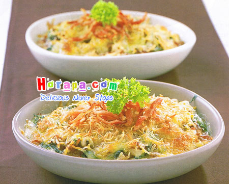 4. ใส่ข้าวกล้อง ลูกเดือย ผักขม ผัดให้เข้ากัน ตักใส่ชามทนไฟ เกลี่ยให้เสมอ โรยหน้าด้วยชีสส่วนที่เหลือ