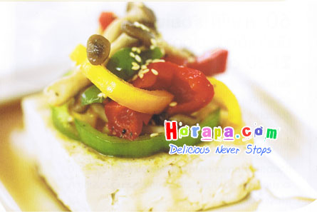4. ตักส่วนผสมที่ผัดไว้ใส่จาน วางทับด้วยเต้าหู้ทอดและราดด้วยน้ำปรุงรสที่เตรียมไว้ โรยงาขาว รับประทานขณะร้อน