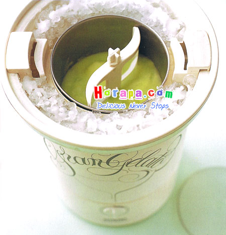 5. เมื่อไอศกรีมเนื้อข้นเหนียวและเนียนได้ที่ ถอดปลั๊กไฟ เปิดฝาถังดึงแกนใบพายออก ใช้ช้อนปาดไอศกรีมใส่ถัง นำถังออกจากโถปั่น แล้วถ่ายไอศกรีมใส่กล่องปิดฝา แช่ในตู้ไอศกรีมจนกระทั่งเนื้อแข็งได้ตามที่ต้องการ