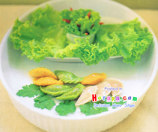 2. นำแป้งมาแผ่บางๆ หุ้มไส้ นำไปนึ่งจนสุก รับประทานกับผักสดตามชอบ