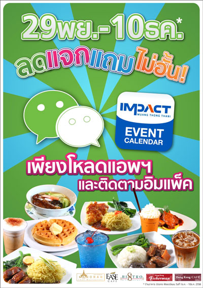 บริษัท อิมแพ็ค เอ็กซิบิชั่น แมเนจเม้นท์ จำกัด มอบสิทธิพิเศษกับ 5 ร้านอาหารในเครืออิมแพ็คผ่านแอพพลิเคชั่น WeChatต้อนรับงานมอเตอร์เอ็กซ์โป มหกรรมการแสดงรถยนต์ที่ยิ่งใหญ่แห่งปีเพียงดาวน์โหลดแอพพลิเคชั่น WeChat และติดตาม?IMPACT Venue? เพื่อรับข้อมูลข่าวสารที่น่าสนใจ ตลอดจนโปรโมชั่นโดนใจต่างๆจากอิมแพ็ค โดยสามารถรับสิทธิพิเศษที่ร่วมรายการได้ที่ร้านอาหารทั้ง 5 ร้านในเครืออิมแพ็คที่ตั้งอยู่ภายในศูนย์การแสดงสินค้าและการประชุม อิมแพ็ค เมืองทองธานี ได้แก่ ร้านฮ่องกงฟิชเชอร์แมน ร้านฮ่องกงคาเฟ่ ร้านมโนราห์ ร้านบิสโตรเดอแชมเปญ และร้านอีส คาเฟ่ อิ่มอร่อยพร้อมรับสิทธิพิเศษนี้ได้ตั้งแต่วันที่ 29 พฤศจิกายน ? 10 ธันวาคม 2557สามารถดาวน์โหลดแอพพลิเคชั่น WeChat ได้ที่แอพสโตร์ (App Store) สำหรับระบบปฏิบัติการไอโอเอส (iOS) และเพลย์สโตร์(Play Store) สำหรับระบบปฏิบัติการแอนดรอยด์ติดต่อสอบถามข้อมูลเพิ่มเติมโทร 02-833-5065