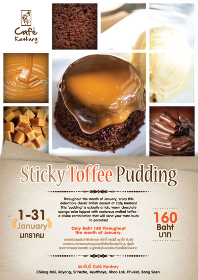 1 ? 31 มกราคม 2558 คาเฟ่ แคนทารีขอเชิญชวนท่านลิ้มลอง "สติ๊กกี้ ทอฟฟี่ พุดดิ้ง" เค้กเนื้อนุ่มชุ่มฉ่ำซอสคาราเมล หอมหวาน เสิร์ฟพร้อมไอศกรีมวานิลลา ราคาสุทธิเพียง 160 บาท อิ่มอร่อยกับสติ๊กกี้ ทอฟฟี่ พุดดิ้ง ท่ามกลางบรรยากาศสบายๆแบบคลาสสิกที่คุณไม่ควรพลาดได้ที่คาเฟ่ แคนทารีสาขาเชียงใหม่, ระยอง, ศรีราชา, อยุธยา, เขาหลัก, ภูเก็ต และบางแสน