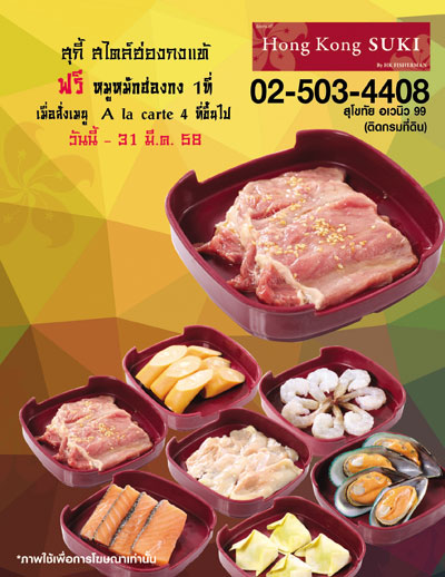 ร้านอาหารฮ่องกงสุกี้ที่โครงการสุโขทัยอเวนิว99 เมืองทองธานี ชวนอิ่มอร่อยกับสุกี้สไตล์ฮ่องกงขนานแท้ พร้อมวัตถุดิบสดใหม่ที่มีให้เลือกอร่อยหลากหลายกว่า 30 เมนู ไม่ว่าจะเป็นเนื้อสัตว์ต่างๆ ลูกชิ้นโฮมเมด หอมแมลงภู่นิวซีแลนด์ เนื้อปลาแซลมอน และผักสดใหม่ พิเศษสุด เมื่อสั่งสุกี้สไตล์ฮ่องกงแบบอะลาคาร์ทครบ4ถาด รับฟรีทันที หมูหมักฮ่องกงสุดนุ่ม หอมน้ำมันงาหมักสูตรพิเศษจนได้ความอร่อยหอมนุ่มทานคู่กับน้ำซุปสุกี้สูตรเฉพาะ3แบบแสนอร่อย ได้แก่ น้ำซุปยาจีน น้ำซุปเสฉวนและน้ำซุปไข่เยี่ยวม้ารากผักชีพบกับโปรโมชั่นพิเศษตั้งแต่วันนี้ - 31 มีนาคม 2558 ณ ร้านฮ่องกง สุกี้ ที่โครงการสุโขทัยอเวนิว99 เมืองทองธานี (ติดกับกรมที่ดิน)เปิดบริการทุกวันเวลา11.00-21.00น. สำรองความอร่อยได้ที่ โทร.02-503-4408 และติดตามข้อมูลข่าวสารจากทางร้านได้ที่เว็บไซต์ www.hkfisherman.com