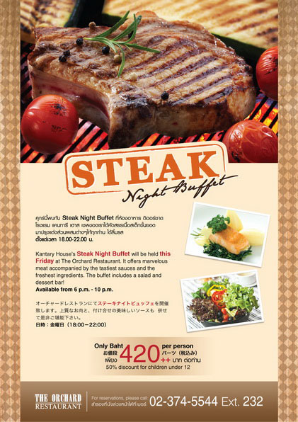 ทุกวันศุกร์ ตั้งแต่เวลา 18.00น. ? 22.00น. พบกับสเต๊กบุฟเฟ่ต์มื้อค่ำ ที่ห้องอาหารดิ ออร์ชาร์ด โรงแรมแคนทารี เฮ้าส์ กรุงเทพ โดยเชฟมืออาชีพที่ได้คัดสรรเนื้อสเต็กชั้นยอดมาปรุงแต่งส่วนผสมต่างๆ ให้ได้ลิ้มลองกัน ราคาเพียงท่านละ 420 ++ บาท สำหรับเด็กอายุต่ำกว่า 12 ปีลดครึ่งราคา