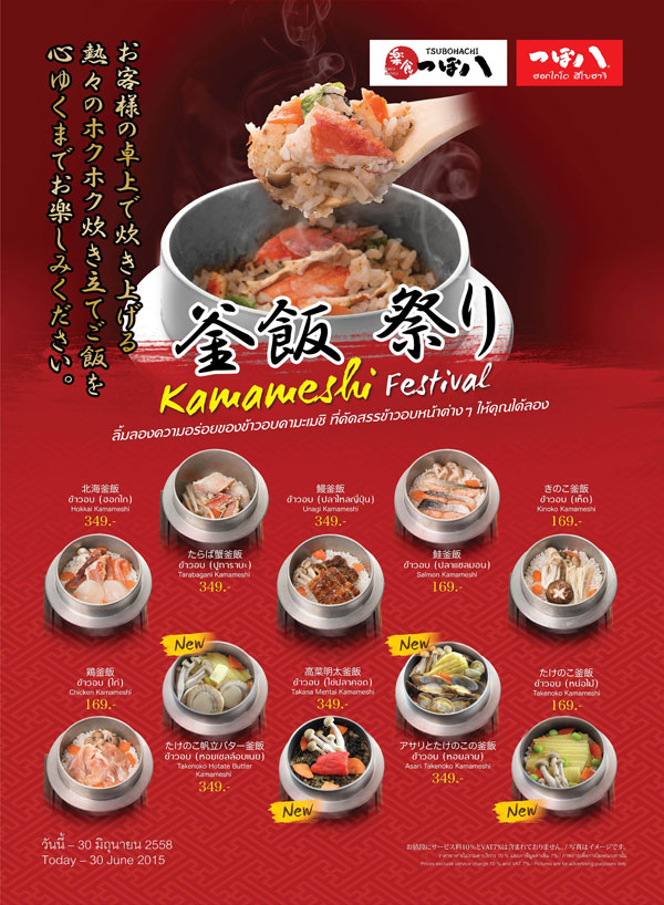 สึโบฮาจิ ร้านอาหารสไตล์อิซากายะ ต้อนรับเทศกาลคามาเมะชิ ด้วยเมนูข้าวอบหน้าต่างๆหลากสไตล์ ถึง 10 เมนู ให้ลูกค้าได้อิ่มอร่อยกันแบบจุใจกับรสชาติแบบต้นตำรับจากข้าวญี่ปุ่นเม็ดกลมหุงเข้ากันดีกับน้ำซุปสูตรเฉพาะ พร้อมทั้งD.I.Yเมนูข้าวอบหอมกรุ่นหน้าต่างๆ พร้อมวัตถุดิบสดใหม่ด้วยตัวเอง ซึ่งเชฟได้คิดเมนูข้าวอบหน้าใหม่เอาใจลูกค้า 4 หน้าเมนูไม่ว่าจะเป็น ข้าวอบไข่ปลาคอด แบบญี่ปุ่นแท้ ตามมาด้วยข้าวอบหอยเชลล์อบเนย ที่คัดสรรหอยเชลล์ตัวโต อบกับเนย หอมมันกำลังดี เมนูต่อมา ข้าวอบหอยลาย ในราคา 349 บาท และเมนูสุดท้ายเหมาะสำหรับคนทานมังสวิรัติกับ ข้าวอบหน่อไม้ ราคา 169 บาทลิ้มลองเมนูข้าวอบหอมกรุ่นหลากสไตล์ได้ ตั้งแต่วันนี้? 30 มิถุนายน 2558 ที่ร้านสึโบฮาจิทั้ง 4 สาขาได้แก่ สาขาโครงการนิฮอนมูระมอลล์ ทองหล่อ 13 ชั้น 1 โทร. 02-185-3323 สาขาโครงการบีไฮฟไลฟ์สไตล์มอลล์ เมืองทองธานี ชั้น 1 (ตรงข้ามท็อปส์มาร์เก็ต) โทร. 02-000-2180 สาขานิฮอนมาชิ สุขุมวิท 26 โทร. 02-262-0331และสาขาธนิยะ (สีลม) โทร. 02-266-5380 ติดตามข่าวสารจากทางร้านได้ที่ www.tsubohachi-tha.com และเฟสบุ๊ค TSUBOHACHITH